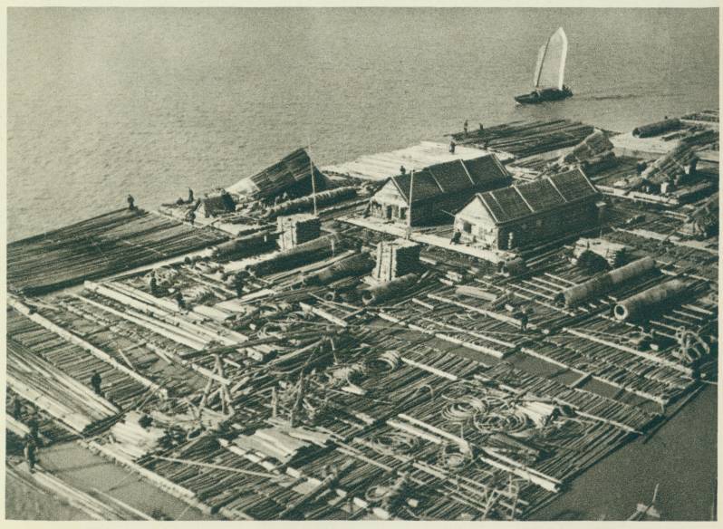 人们在四川江安扎好竹筏,然后把它投入长江中。竹筏沿江顺流而下,长达数周才能到达目的地。从照片中可以看到,竹筏上还搭建有简易的房屋。