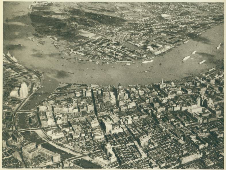 黄浦江与苏州河交汇之处,在1000米高空拍摄。照片前部是高楼林立的商业区,后部是浦东区。