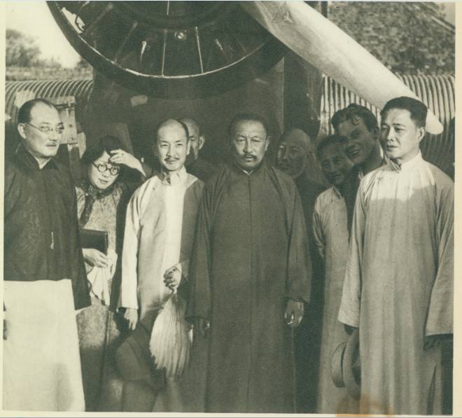 1934年7月,第九世班禅曲吉尼玛(前排居中着深色长袍者)乘机由南京飞往北平(北京)。送行人员中有戴季陶(前排左三)、汪精卫(前排右一)等民国政要。