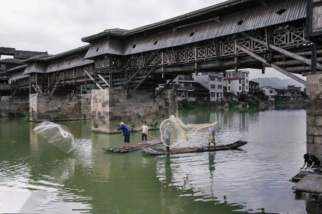 遮雨廊桥,碧虹天落,行客登临惯:写镇安桥,位于福建省浦城县临江镇,是闽北保护最好的古廊桥,始建于明洪武十二年(1379年),原先旧名临江桥,明正统一十一年(1446年)更名为镇安桥。连接水东,水西两村重要通道,是木石结构廊桥,桥基4墩,3孔,方石砌成,墩上游尖,下游平,呈船形,以利导流,同时增加美观,墩上用圆木,井字形平铺叠涩为拱,再平放巨木为梁,墩头有神鸟,形石雕雄立,相传以镇水魔。