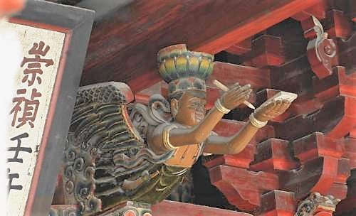 妙音:大雄宝殿的斗拱上,有24尊木雕飞天,被称为妙音鸟。