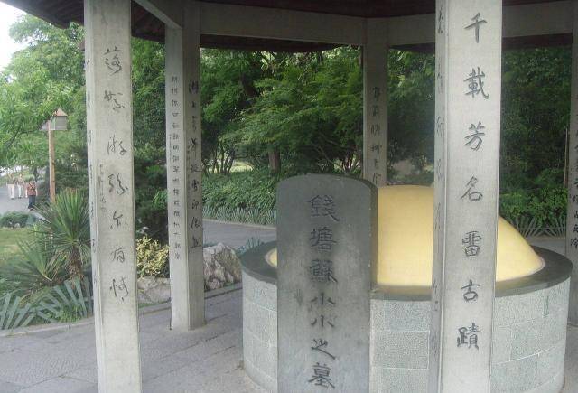 相传苏小小死后葬于西湖西泠桥畔,后人仰慕她的文采在此建墓。南宋时仍有墓在。墓前有石碑,上面有题字:“钱塘苏小小之墓。”墓小而精致,上覆六角攒尖顶亭,叫做“慕才亭”,据说是苏小小资助过的书生鲍仁所建。