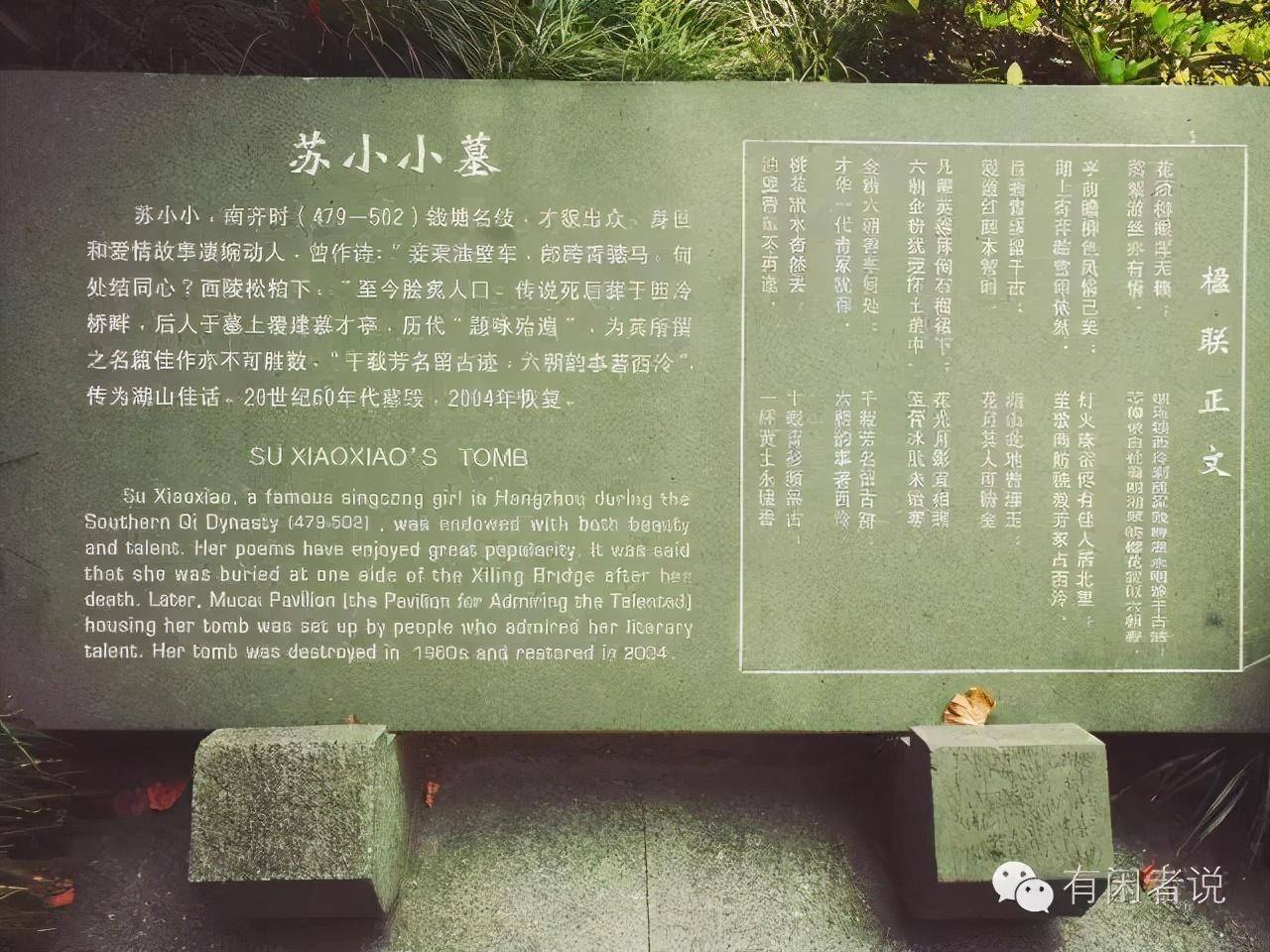 苏小小墓:即慕才亭,位于杭州西湖西泠桥畔。苏小小是中国古代文学中的一个经典形象,正史中并无记载。多作为才貌双全的佳人形象出现在诗歌、小说等文学作品中,厉声教、白居易、刘禹锡、李贺、权德舆