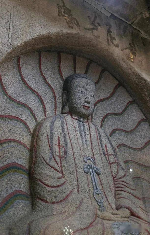 呈现辉绿岩(青斗石)颜色,背有毫光射纹饰,呈现花岗岩石质,散发披肩,面相圆润,眉弯隆起,嘴唇稍薄,嘴角两线深显,下颚圆突。身着宽袖僧衣,胸襟打结带,无扣,结带用圆饰套束蝴蝶形,而向两侧下垂于脚部,双手相叠,手心向上,置于膝上,神态庄严慈善,衣褶简朴流畅,用对称的纹饰表现时代风格。这是目前世界仅存的一尊摩尼教石雕佛像,列为全国重点文物保护单位。
