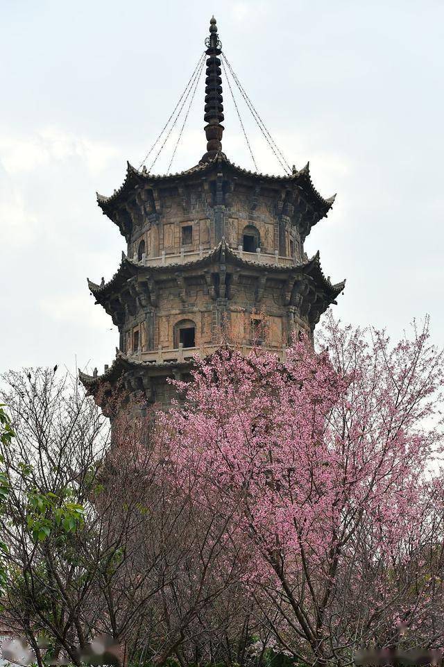 岿巍矣、塔东西不朽。锦簇矣、木棉银杏秀。榕须舞、鸽翩翩。庄严热闹人勤佛,心无旁骛梵音旋。觅高标,弘一在,静听禅。