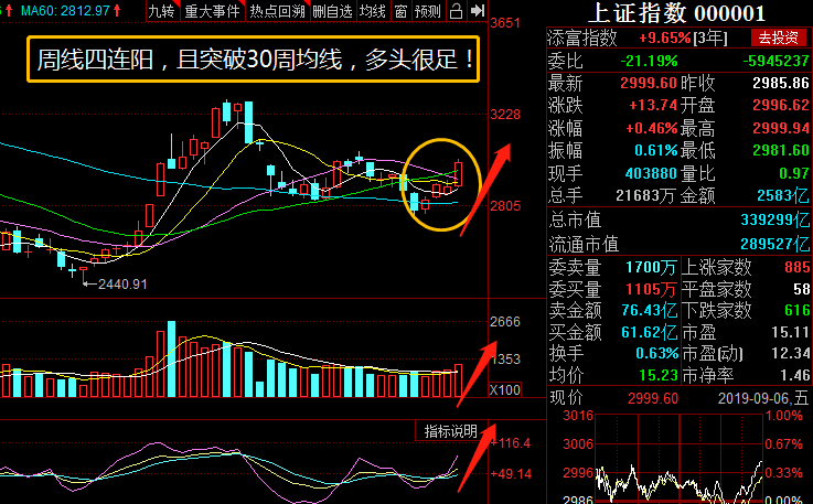 大家好,我是盘之感!本周,上证综指结束震荡,选择向上变盘,相继收复2900点和半年线,盘中一度站上3000点整数关口,连续5日上涨,并留下2957.41—2972.66之间跳空缺口,走出逼空行情,周K线收出长阳线,重返3000点,创出两个多月新高。截止周五收盘时,上证综指收于2999.60点,涨幅3.93%。