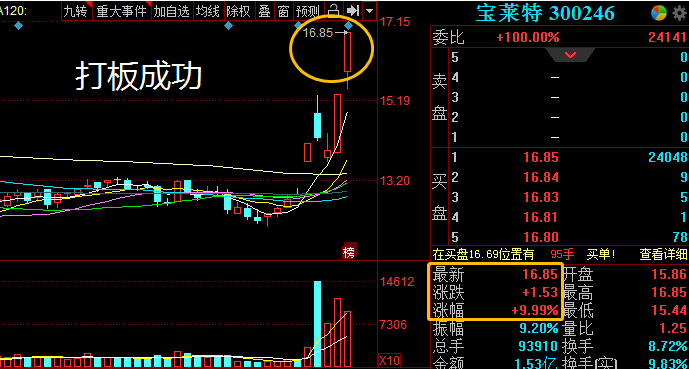 个股方面:昨天五盘之感给大家点的宝莱特符合打板条件,买入打板成功,恭喜有把握到的家人朋友!
