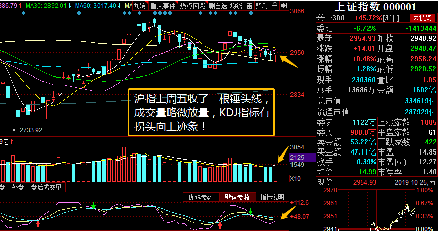 盘面上,上周五早盘开盘后猪肉及养殖业、数字货币走强,猪肉、养殖的得利斯、益生股份、牧原股份封板,算是高潮了;午后创投板块异动拉升,德美化工涨近7个点;盘中受消息刺激,中药板块异动,陇神戎发封涨停。截止收盘涨停36家,跌停7家,上涨2422家,下跌1047家。对于后市,周末利好消息非常多,本周重要会议召开,指数下有60天线支撑,KDJ指标有拐头向上迹象,本周指数大概率偏震荡向上,尝试突破2975一线压力,然后才能向3000点进发,如不能突破则还将维持一个震荡走势。