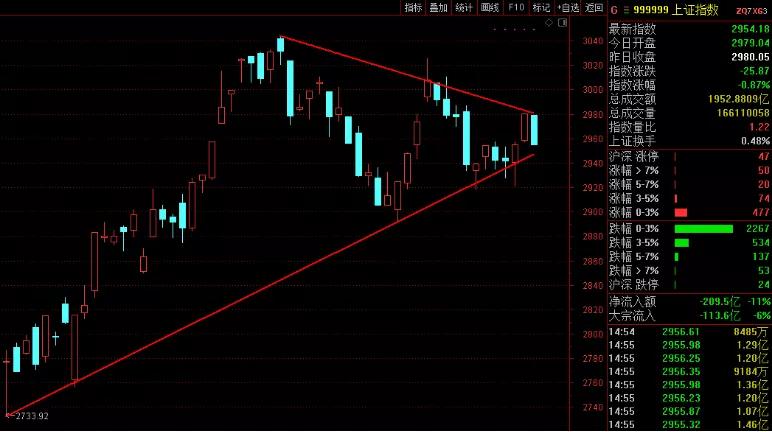 盘面上,炽热的区块链概念股迎来明显分化,临近收盘时不少个股出现炸板潮,其中次新股、芯片、5G、G产软件等科技股率先走弱,证券、银行、保险等权重股下挫,猪肉等养殖股表现活跃,农业种植板块盘中获得拉升。场内跌停家数20余家,炒作氛围降温,成交量未获放大,资金高位套现下,大盘尚有回撤空间。大盘指数日线级别的收敛三角形还在继续,方向上的选择即将开始。今明两天应该是比较关键的交易日,如果今天放量反包回去,或部分反包,就还有希望脱离形态上的风险。但是,如果还是杀跌下来,周一走好的形态或将被破坏。