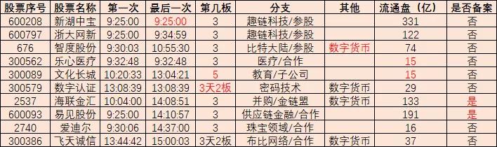 区块链:昨天继续分化,区块链板块成交了1000多亿,要知道创业板整个板块成交额才1000亿不到,可见这个板块吸金多严重。从这个方面来说区块链有些大盘个股大阴线就是大阴线了,短期内不会有资金来解放,区块链个股如果继续炒作大概率是以小盘股为主。新湖中宝继续超过两百万手封单,这个票作为板块风向标,只要不倒板块都有参与价值。昨天板块涨停只有10只,这10只的基本情况如下表: