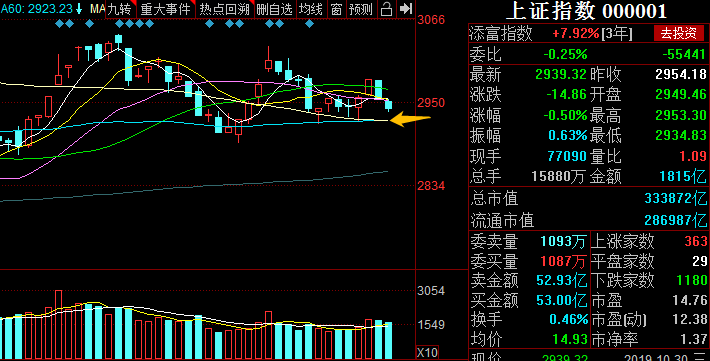 盘面上,数字货币、智能音箱、动物疫苗等板块涨幅居前;区块链、农业、稀土等板块跌幅居前。区块链板块继续分化,仅剩下几只龙头股表现强势。集成电路产业链板块冲高回落。与区块链概念高度相关的数字货币板块全天波动剧烈。二胎概念、水产养殖业等板块盘中均有异动拉升。指数看,大盘已经回调了两个交易日,且再次考验60天线2920一线的支撑性,大盘今天非常关键,如果跌破了2920那就偏空了,反之还有希望向上。