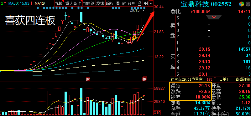 个股方面:上周二盘之感给大家点的宝鼎科技上周五再次涨停,录得5连板已成妖,而我们上周二布局,喜获四连板,恭喜有把握到的家人朋友!