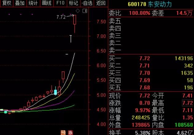 东安动力:昨天特地讲的票,昨天如期成为市场高度板,换手四板,逻辑虽然走的不是军工,但是本身业绩好盘子小,市场情绪回暖继续走高就正常了,本身质地是比较不错的,不管走什么概念只要能继续走强对市场就是正向刺激,继续关注就好,不过继续加速板的话就没好的买点了,没先手的看看就好。光威复材走势比较稳定,但是稍微墨迹了点,自己决定去留;中航高科小肉,今天择机跑路即可;中船防务板块人气龙头,走成了大趋势股尾盘拉板,这种票一般都没什么溢价,如果板块不错,高风险偏好的可以逢低关注短线机会。中航电子:前期机构爆买的趋势票,板块走强的情况下应该不会太差,今天逢低关注短线机会。
