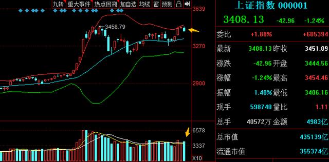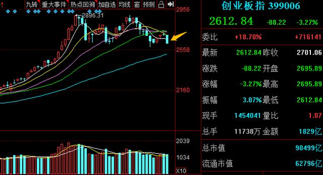 大家好,我是盘之感!继昨日高位震荡滞涨后,今天三大指数集体小幅低开,开盘就注定今天要走弱,果不其然,今天三大指数集体下跌。午后证券虽启动一度带领沪指翻红,但尾盘券商冲高回落,指数继续跳水,尤其创业板指全天上演无抵抗式下跌,跌逾3%,以光头光脚大阴线报收。截止收盘,沪指跌1.24%,深成指跌2.09%,创业板指大跌3.27%,北上资金因台风问题推迟到下午一点半恢复,合计净流出54亿,其中沪股通净流出17亿,深股通净流出37亿。