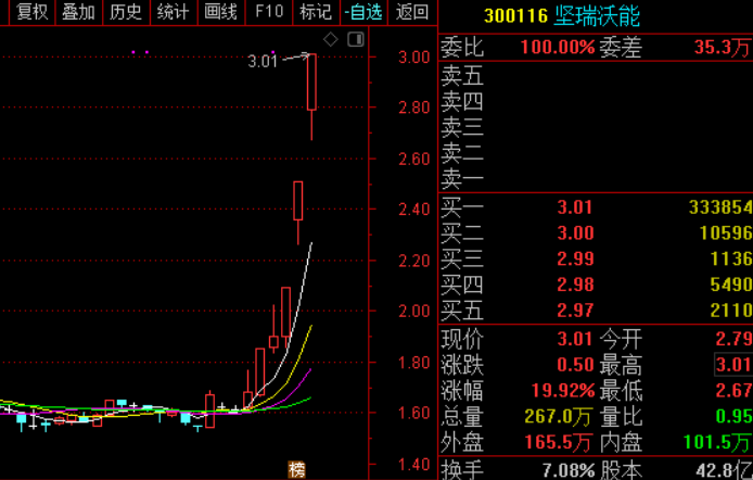 坚瑞沃能:创业板第一低价股,垃圾中的战斗机,这票本身一块多,就要退市了,但是这波注册制直接启动,2个星期不到直接启动翻倍,翻倍仍然是创业板第一低价股,本身是温州帮庄股,所以游资都没怎么去。这票是锂电池概念,刚好也算是在风口,据说是要更名,有资产运作,真假不管,这么高的庄股肯定不去了,但是低价股是实实在在的启动了,而且资金进来不少,短期低价股可以留意一下。吉艾科技:区块链+股权转让,刚开始放量,比较安全。安控科技:芯片+海南+安防概念股,近期连续放量多次涨停,股性活跃,昨天刚好站稳年线,今天不单边下跌的话应该是不错的机会。