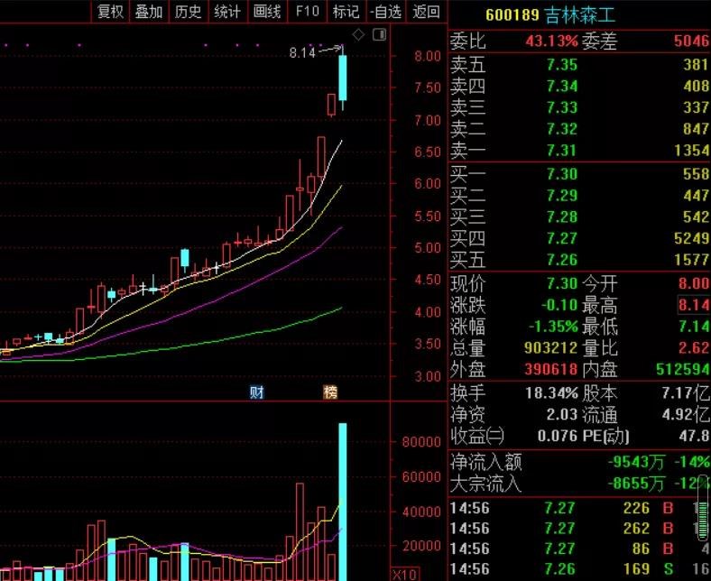 吉林森工:昨天大消费没有代表性的个股,所以仍然讲讲这个农夫山泉概念股。这票周一就加速昨天继续加速很合理,所以板上被砸了,农夫山泉9月8号港股上市,预计这票还有反复,昨天就这么个砸盘方式出货也出不完,预计止跌之后仍然会有拉升给机会,有兴趣的可以留意一下。大消费昨天调整,但是应该还有一波拉升,再有大涨加速的个股要注意风险了,看空的研报不是随便出的,是个信号,该撤退就撤退。荃银高科:农业概念股,走势不错,刚好昨晚上有消息,天山生物也复牌,逢低关注应该还不错。