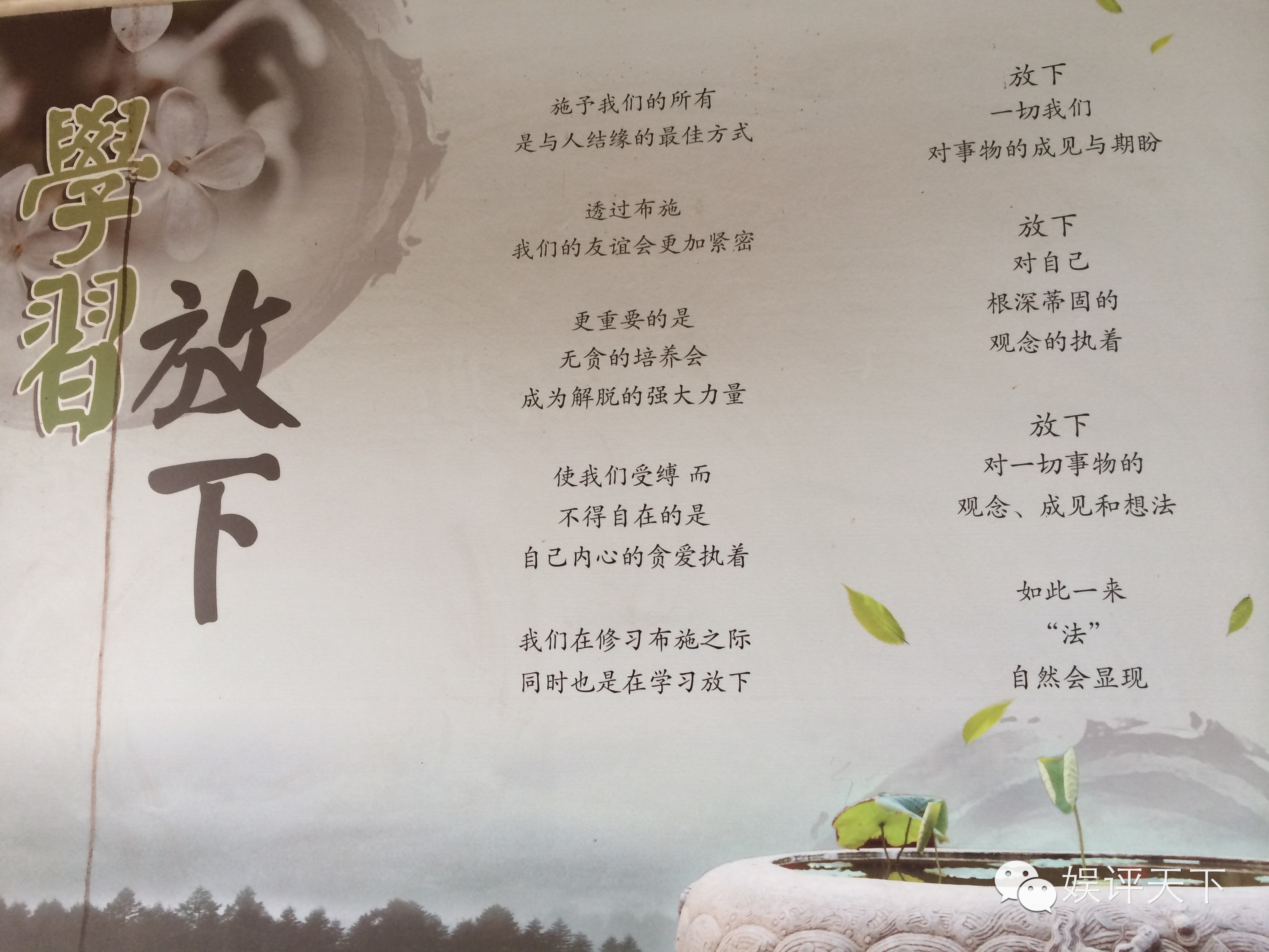 门口的展板“学习放下”,写的特别好,即便你不懂佛法,看到这些语句也是温暖的心灵鸡汤。“使我们受敷而不得自在的是,自己内心的贪爱执着”,所以我们才要“放下一切我们对事物的成见与期盼”。
