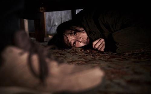 女主进入房间发现女孩被捆在床上,刚报警就有人进屋,只好藏在床底下。