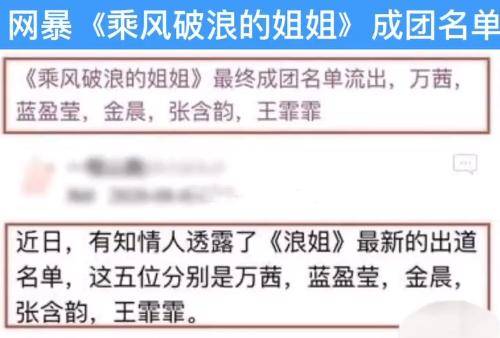 近日,网络爆出消息称《乘风破浪的姐姐》最终成团的五人是万茜、蓝盈莹、金晨、张含韵、王霏霏。