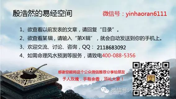 ★本空间所有文章,除极个别注明“转载”外,其余均为殷浩然独立撰写,每篇文章都凝结着浩然大量的心血。十分欢迎您转载、分享到朋友圈,或推荐给您的朋友,让更多的人接触并了解易经文化。予人玫瑰,手留余香。传播善法,是“法布施”,具有很大的功德。
