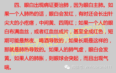 三、人的黑眼珠子属肝。如果一个人的肝脏不好,就会在黑眼珠上表现出来。患有肝炎的人,眼珠会呈现黄色,虹膜上会有斑点;当一个人肝上有病时,眼睛颜色会发黄、浑浊,视力下降,而且还干涩、多泪。如果是黑眼珠周边发白,则是血热、血淤的表现,这多见于心脑血管硬化的病人。如果一个的肝气郁滞的话,黑眼珠就会胀起,并伴有肋痛。