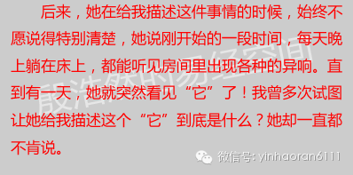 后来她叫女儿回家陪她睡,奇怪的是女儿什么也听不见,但她却天天夜里都能听到同样的声音,女儿认为可能她精神上出了问题,于是带去医院看精神科。医生诊断为幻听,开了一些药服后也没有什么效果,每天晚上都要通过服用安眠药才能睡个安稳觉。