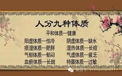 每个人都有不同的体质特征,例如有的人大冷天,却穿着单衫不怕冷;有的人饭量很大,但却吃不胖;有的人一吃海鲜就过敏等等,人与人之间存在的这些差异,在中医学里就叫做“体质”,中医学将人的体质分为9种类型,分别是:平和型、气虚型、阴虚型、阳虚型、湿热型、气郁型、痰湿型、血瘀型、特禀型。