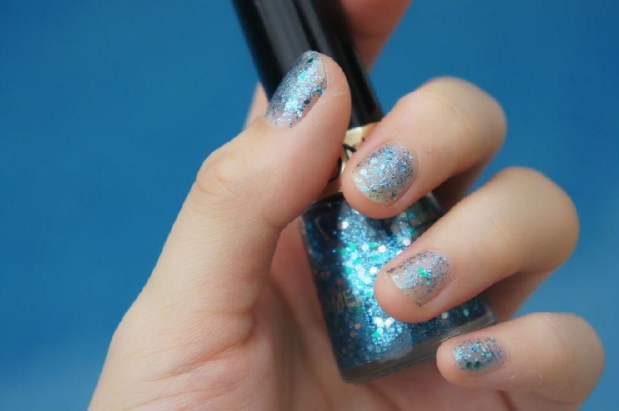 海边涂上海蓝色的甲油再适合不过了,不想做蓝精灵的亲可以和我一样用露华浓经典的迷你加油441#,独特液态丝配方令涂抹顺滑均匀,只是涂抹一遍就能让其中的小亮片和亮蓝色颗粒均匀的覆盖在指甲上。