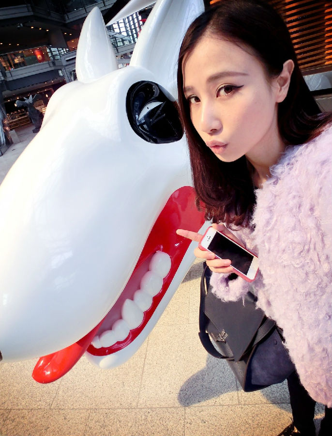 介货是嘛玩意儿~~在芳草地老远就看到服务台旁边那矫健洁白的身影,仔细观察看看完美无瑕的左脸和右脸的黑眼圈胎记才恍然大悟,原来是牛头梗君!此时此刻我的手里已经不应该拿着“苹果”,拿个香肠才对~