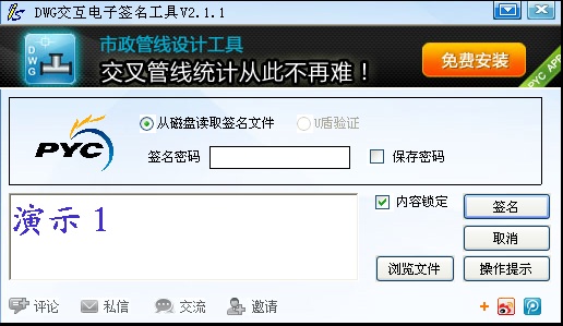 鹏宇成CAD电子签名软件-DWG交互式电子签名工具采用电子签名技术,结合数字证书技术、网络加密技术而设计的数据安全产品,采用插件技术与AUTOCAD产品无缝连接,用户在正常编辑文档的方式下就可以在AUTOCAD图档(DWG格式)内部实现电子签名。当图档被他人编辑后,设计者所签署的名字会自动失效。确保DWG图档的责任归属性。