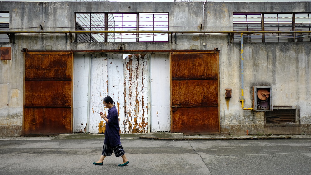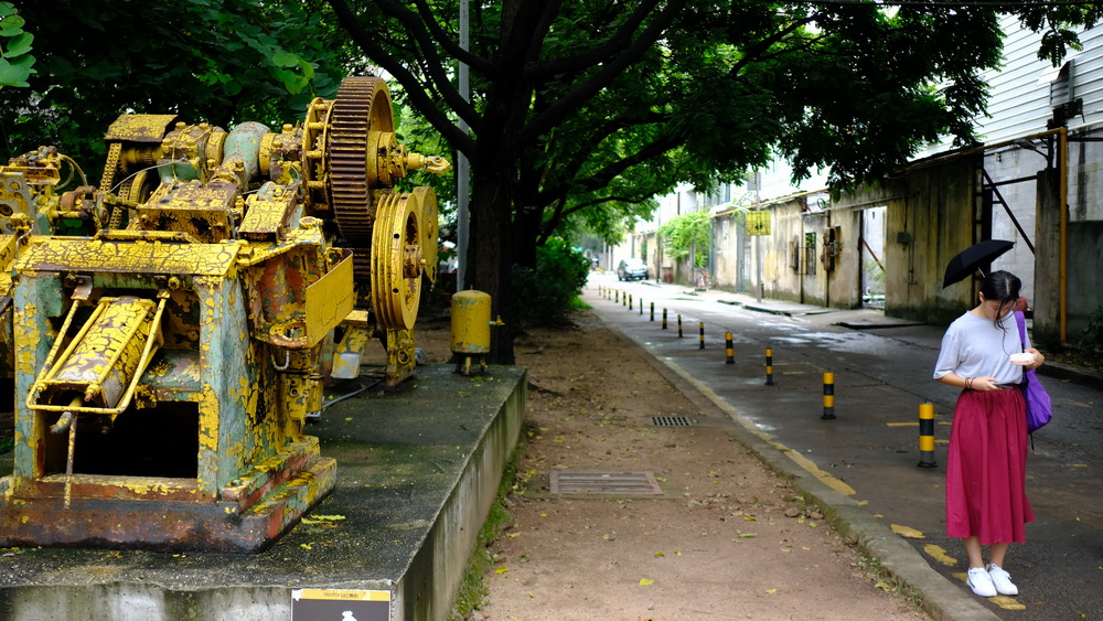 随意摆放的废旧机器,昭示着老工业时代的逝去,青春少女的身影,是广州这座商业大都市的清新的画面。