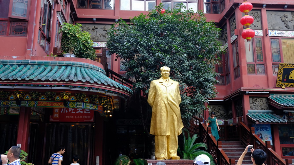 火宫殿大院里的毛主席雕像,在红色的仿古楼群里,金光闪闪,熠熠生辉。