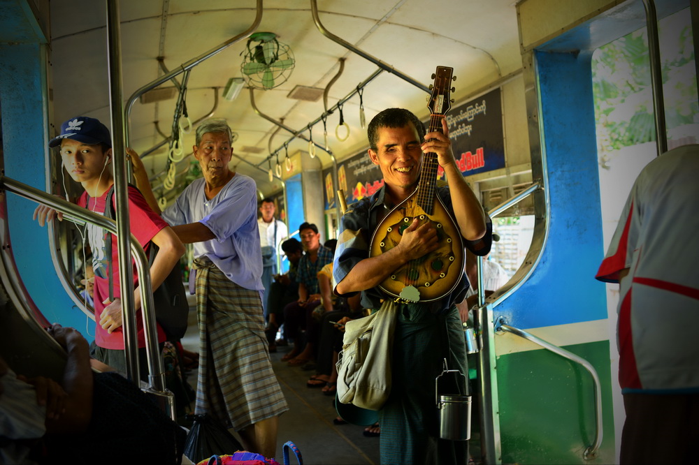 车厢里的座位靠窗隔成相对的两排,人们习惯盘着脚坐,后来遇见的人们,一概如此,打坐如仪。包括出租车司机,盘着腿驾驶,勉强伸出一只右脚踩油门和刹车。三教九流、贩夫走卒挤满车厢,许多小贩顺便背个小筐穿梭在各个车厢做起了生意,卖槟榔、竹器、扫把、蔬菜、膨化油炸食物的,应有尽有。我分别在火车上给一位盲人卖唱者投了500缅币;又花500缅币买了一斤橘子。后来在唐人街,发现卖水果的路边小贩,同样500缅币只给了2个橘子。所以这一斤橘子虽然吃起来口感无味水少略渣,我们却已经心满意足了:在仰光市区,基本找不到水果店,不知为何,无解。