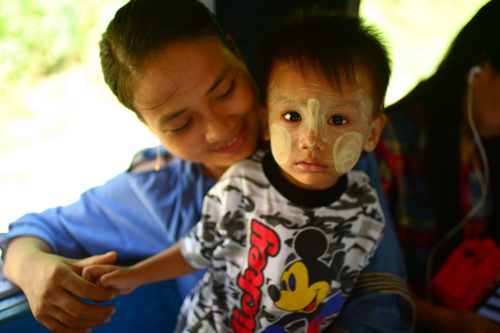 面对我们的镜头,缅甸人都表现出泰然自若的样子。要是看见可爱的孩子,母亲还会微笑着鼓励孩子面对我们的镜头。孩子和年轻的母亲,通常与街上遇见的女性一样,都在脸上涂上一种叫“塔纳卡”的东西,那是用香木或檀香木磨的粉,和上水涂在脸上,据说有祛痘美肤防晒的功效。爱美的女孩子,会把塔纳卡涂出更多的花样,我称之为“缅甸面谱”。