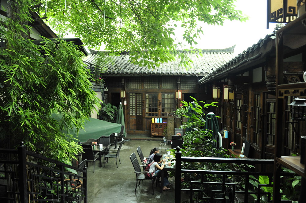 石板街上,闲者慢慢坐忙人匆匆过、弄堂客栈、精美的门头、梧桐树、街檐下的老茶馆,街边店铺摆卖的小吃,声色香俱全,飘满整条街。几个老人在老茶馆门口喝茶摆龙门阵,花猫懒懒地蹲在脚边打盹,暖暖的阳光透过梧桐树,投下斑驳的影子。信步走进一个深深的院落,安静无人,院里的树上挂着一对画眉,人来亦不惊。