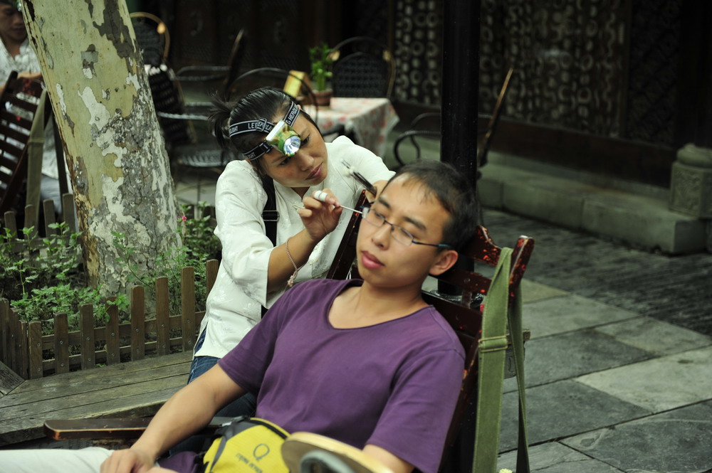 路边树下,有个女的穿着白大褂,头上箍着牙医用头灯,对着一男的耳朵端详,左手举着大小耳勺棉签镊子花样繁多的工具,乍看似大夫巡诊,近看却是掏耳朵。那男的半躺竹椅,眯着小眼做陶醉状,任由大小家伙什在耳朵里进进出出,那个神情诱惑了路人,开始有人排队,等着享受花钱掏耳朵的待遇。