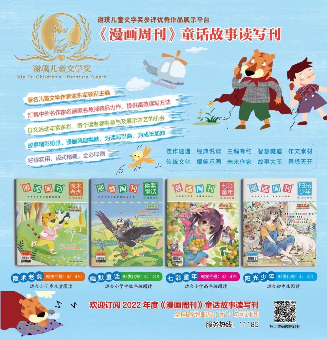 《漫画周刊》童话故事读写刊(魔术老虎、幽默童话、七彩童年、阳光少年)可常年在全国各地邮政局(所)征订,也可在中国邮政报刊发行平台订刊(点击左下角“阅读原文”进入)。团体(以班级或学校为单位)直订,请与本刊发行部联系,扫下方二维码订刊:https://mmbiz.qpic.cn/mmbiz_png/WV2ZRS4ibicw1efkgx7MQtiaFUlJ36mEdEB5QqHianTE8RcXFueibfAjXKFib0rw1icAzMT5vF5TCv2oxTT7duWA54aDQ/640?wx_fmt=png&wxfrom=5&wx_lazy=1&wx_co=1