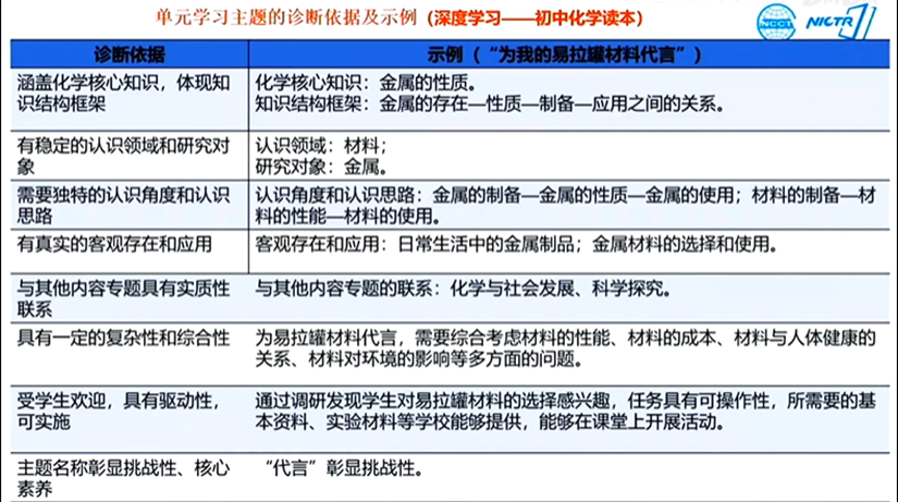 确定完单元学习主题之后,还有诊断依据,比如是不是涵盖了化学核心知识,体现了知识结构框架。如果能符合这些依据,说明这个主题是很好的。
