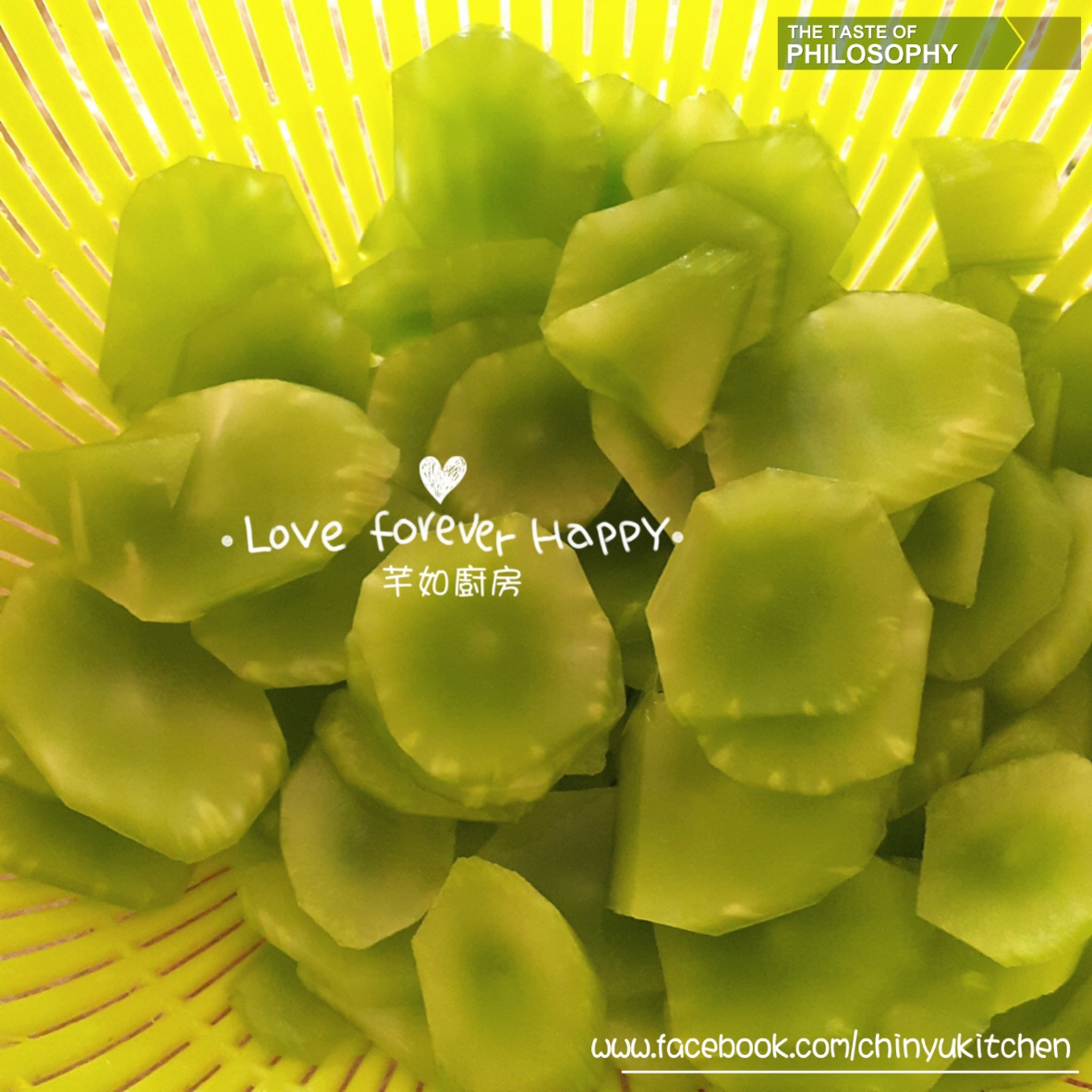 4 燒熱油鍋, 下蒜蓉爆香, 下萵筍片炒勻, 下調味料炒至萵筍片軟身, 上碟, 即成清炒萵筍