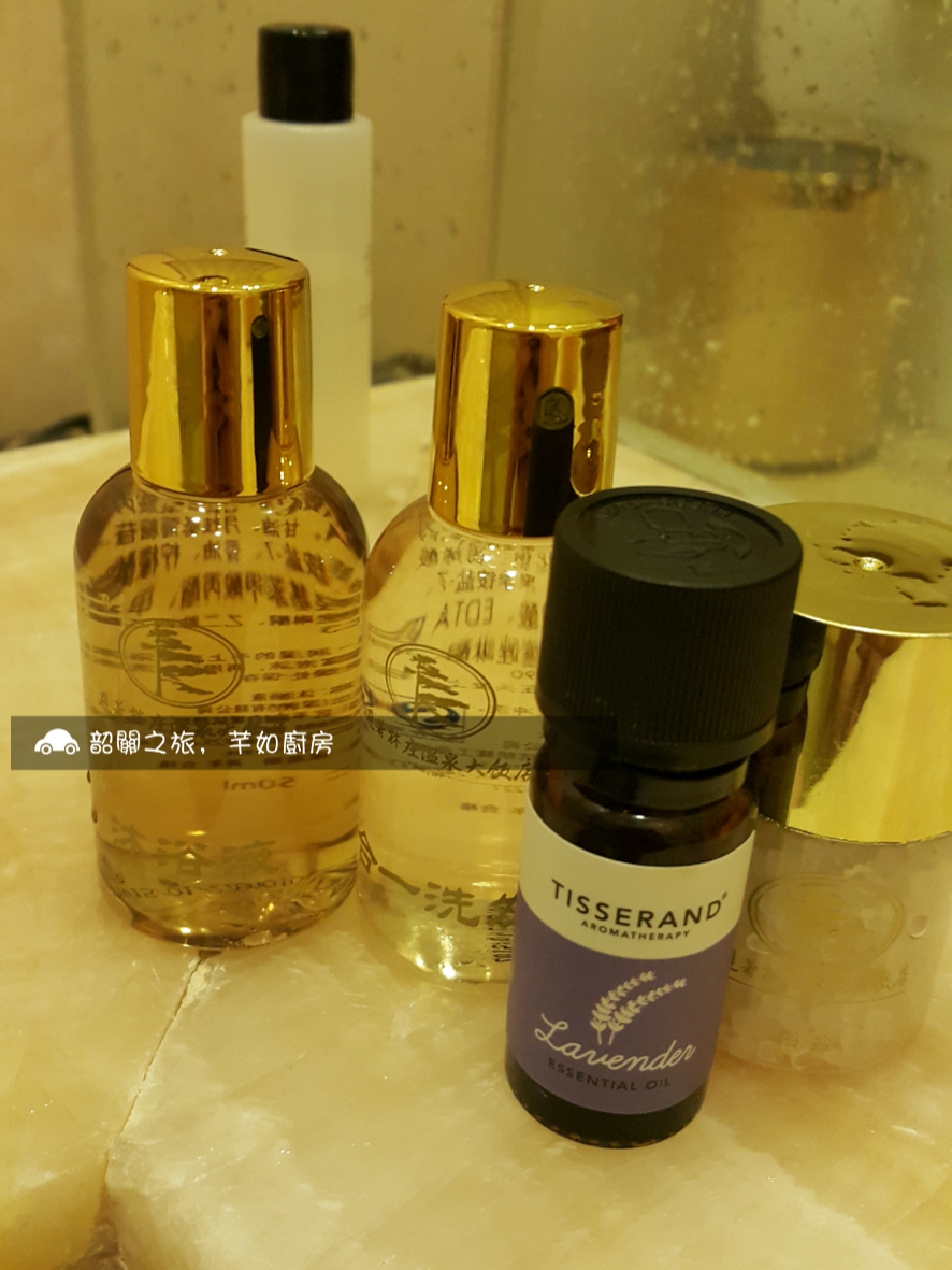 酒店提供沐浴液, 洗髮精和浴鹽, 薰衣草精油是芊如自己帶的哦 (一笑)