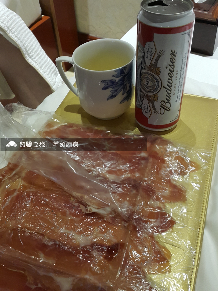 夜宵時間到, 我們在房間內吃巴馬火腿配啤酒, 一流!