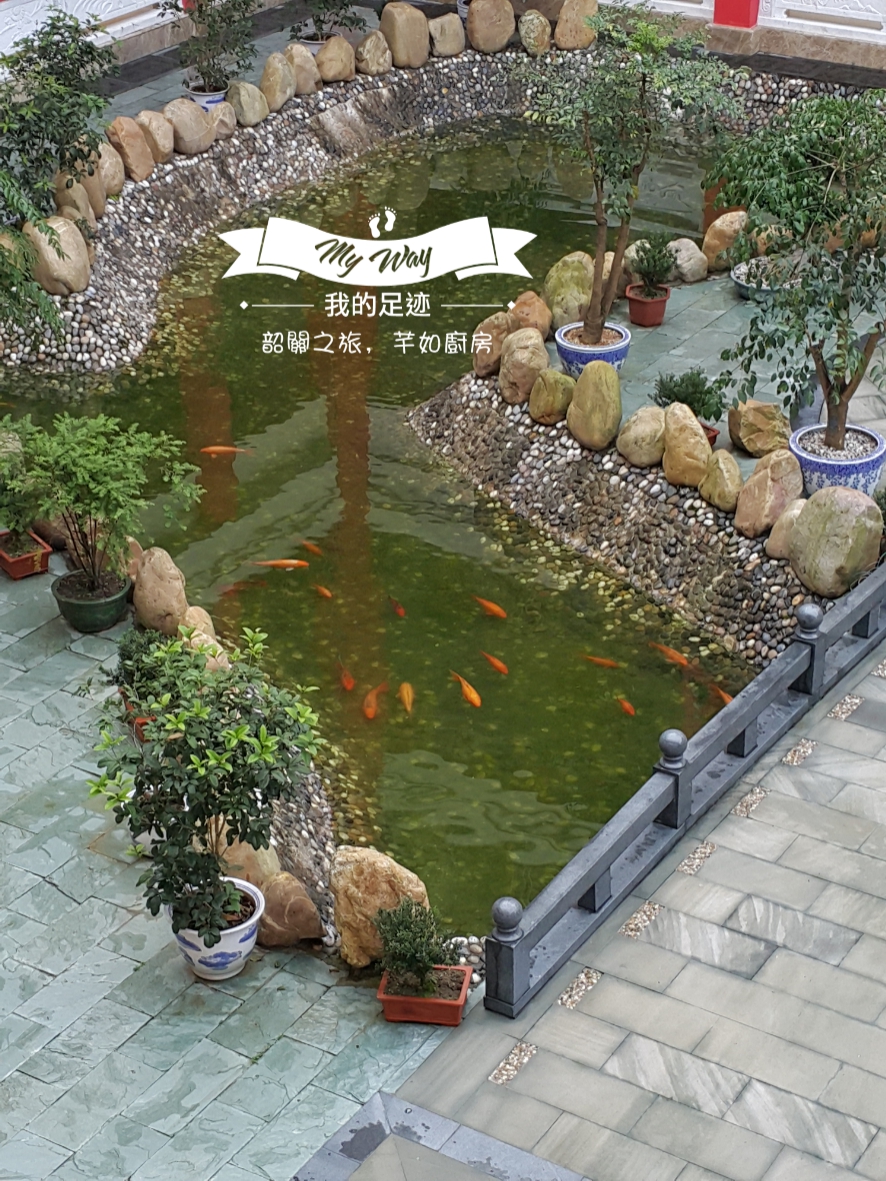 從地面看四合院形式的景區, 有多種植物及有小橋流水