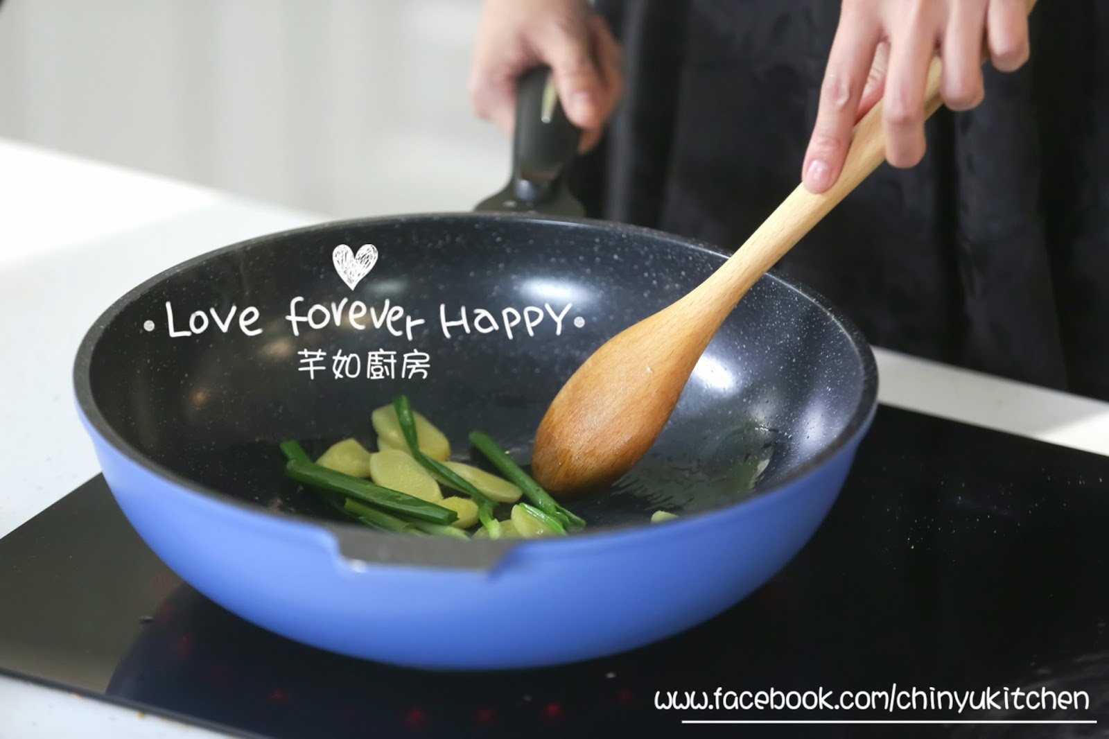 5 燒熱油後, 下薑蔥爆香後灒紹酒, 蓋上鍋蓋略燜一會