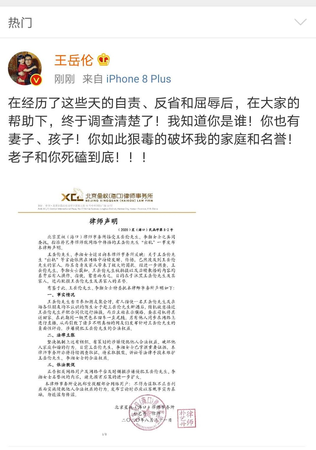 随后王岳伦发微博表示:在经历了这些天的自责、反省和屈辱后,在大家的帮助下,终于调查清楚了!我知道你是谁!你也有妻子、孩子!你如此狠毒的破坏我的家庭和名誉!老子和你死磕到底。李湘随即转发,力挺老公。