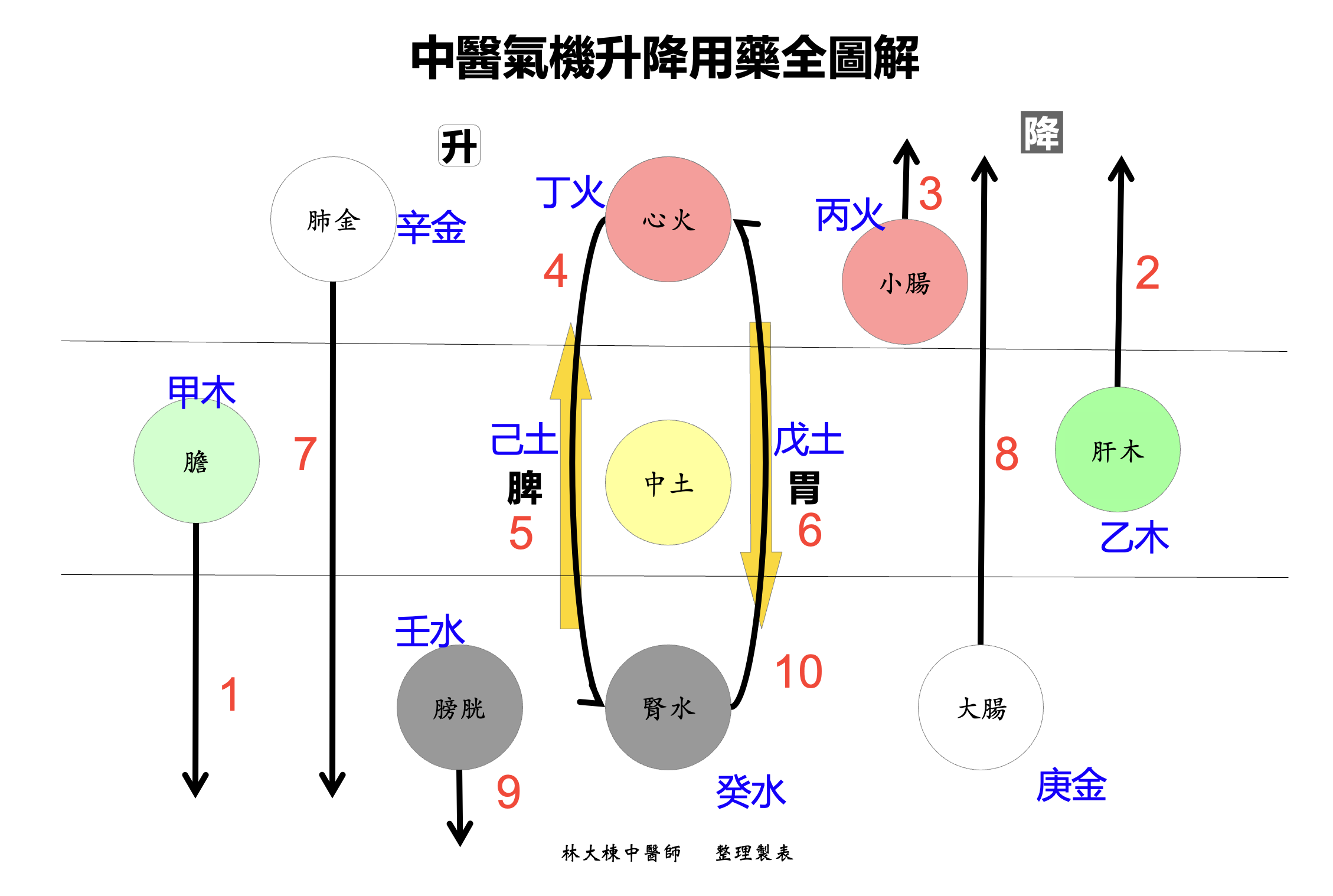 中氣升降,是生陰陽,陰陽二氣,上下回周。陰位於下,而下自左升,則為清陽,陽位於上,而上自右降,則為濁陰。清陽生髮於木火,則不至於下陷,濁陰收藏於金水,則不至於上逆。清氣之下陷者,陽噓於上也,濁氣之不逆者,陰吸於下也。濁氣不逆,則陽降而化陰,陽根下潛而不上飛,清氣不陷,則陰升而化陽,陰根上秘而不下走。彼此互根,上下環抱,是曰平人。而清氣之左升,賴乎陰中之陽生,陽生則浮動而親上,權在己土,濁陰之右降,賴乎陽中之陰生,陰生則沉靜而親下者,性也,是以金收而水藏。而金水之收藏,全賴胃土之降,胃土右降,金收於西而水藏於北,陽氣蟄封,此木火生長之根本也。 胃土不降,金水失收藏之政,君相二火泄露而升炎,心液消耗,則上熱而病陰虛。 人知其金水之虧,而不知其胃土之弱。胃以陽體而含陰魄,旺則氣化而陰生。以氣統於肺而實化於胃,肺氣清降而產陰精,即胃土之右轉而變化者也。是宜降肺胃以助收藏,未可徒滋心液也。