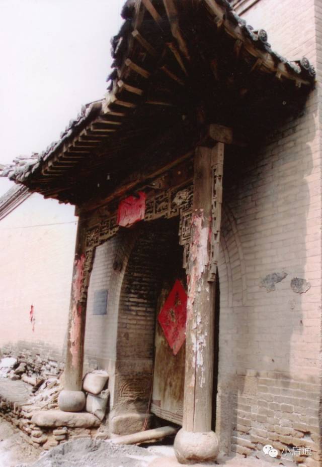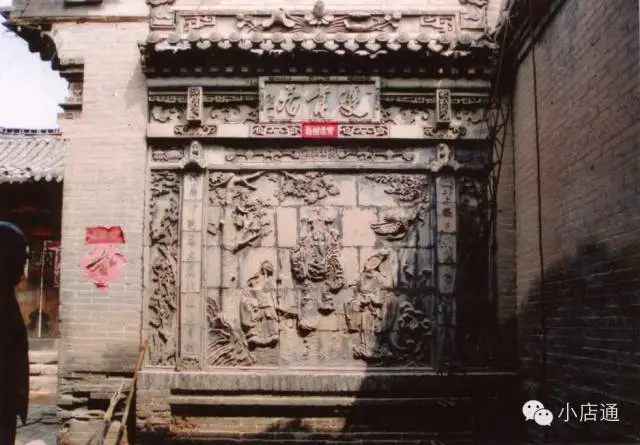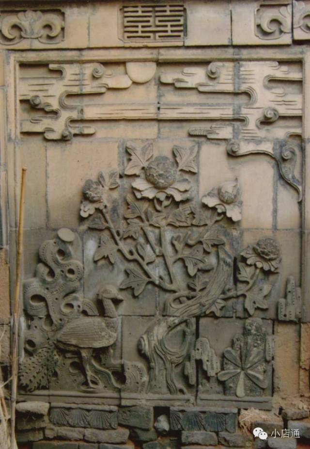 三门楼两边隔墙的前后都有砖雕。正面右为耕读、松鹤,左为渔樵,鹿鹤,意为耕读传家,诗出育人,松鹤延年,六(鹿)合(鹤)同春,六合指上下和东西南北四分,泛指天下成宇宙,寓意普天之下生机盎然,欣欣向荣。背面为孔雀戏牡丹,寓意吉祥富贵。后院,只剩东、西各五间单坡硬山顶瓦房。支摘窗、墀头,上部为福、禄,中部为麒麟,麒麟和龙、凤、龟并成“四灵”,麒麟,民间有麒麟送子的说法,有能使圣贤广进的神力,寄托人们的望子成龙的企盼。
