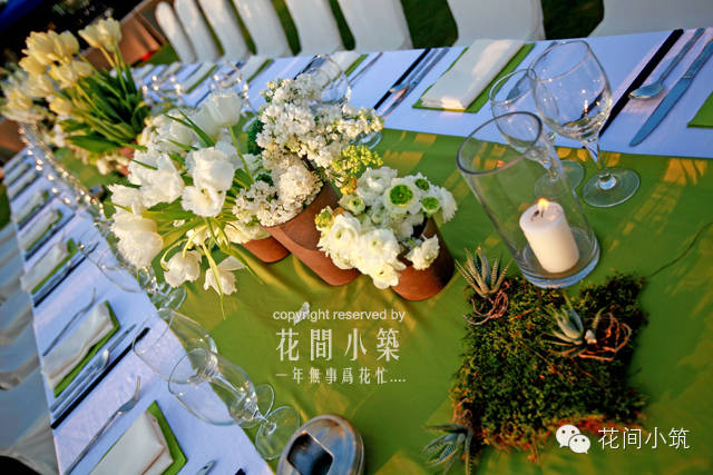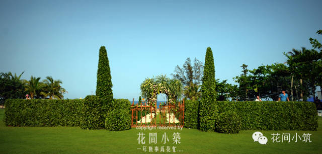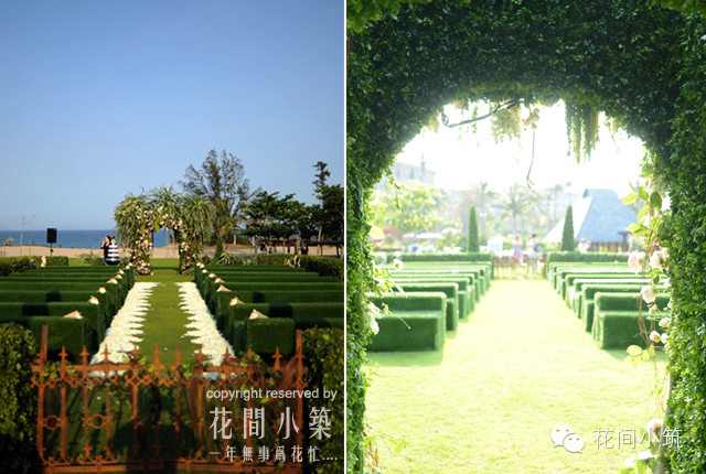 室外的婚礼仪式在天域酒店的一个被郁郁葱葱的植物包裹的长方形的草坪。小筑充分的利用了场地的仪式亭和纵向长度,打造了一个温馨的户外花园。