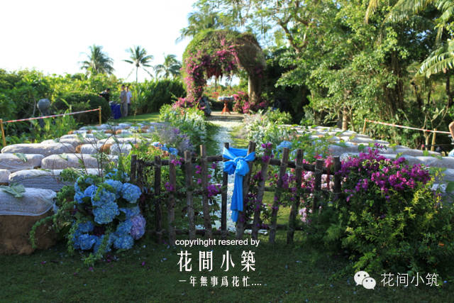 路引小筑用了丛生状的花艺,一路丛仪式开始处那扇粗旷的木门一直延伸到仪式亭。仪式区的座椅都用了海南特色的椰丝制作哟,既柔软又特别,还绝对的海南风哦~