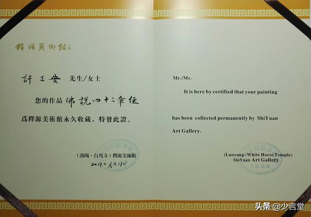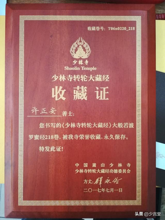 小楷作品《大般若波罗密经》218卷9000余字,被嵩山少林寺藏经阁永久收藏;小楷作品《佛说四十二章经》2400余字,被洛阳白马寺永久收藏!
