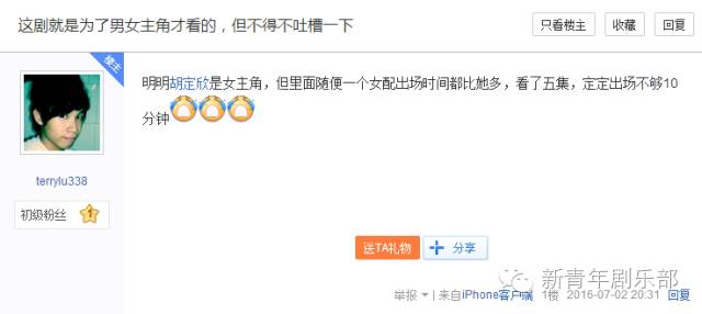 但也有不少网友反映女主胡定欣的戏份太少,不够过瘾